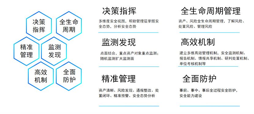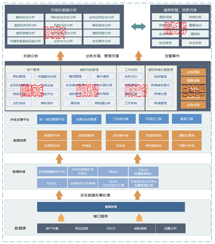 建立集資產管理、通報處置、監測感知、協同工作于一體的安全感知與協同作戰指揮體系,通過該平臺實時掌握區域級網絡安全態勢,及時掌握網絡攻擊情況,及時發現網絡安全事件、漏洞線索,掌握有關情報和情況信息,及時通報預警重大網絡安全威脅,防范和打擊網絡攻擊等違法犯罪活動,提升網絡安全基礎能力和基礎設施防護能力,保衛關鍵基礎設施安全,維護公共網絡安全秩序。